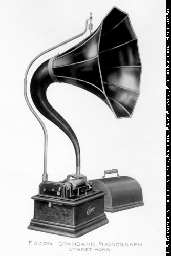 «…Играть нужно было в длинную оловянную трубу, которая узким своим концом была соединена со стальной иглой, которая рисовала дорожку на вращающемся диске, покрытым пчелиным воском. На диске получались волнообразные полосы.