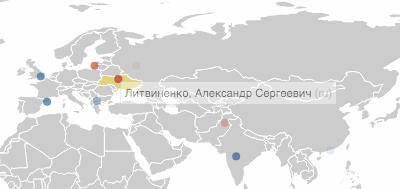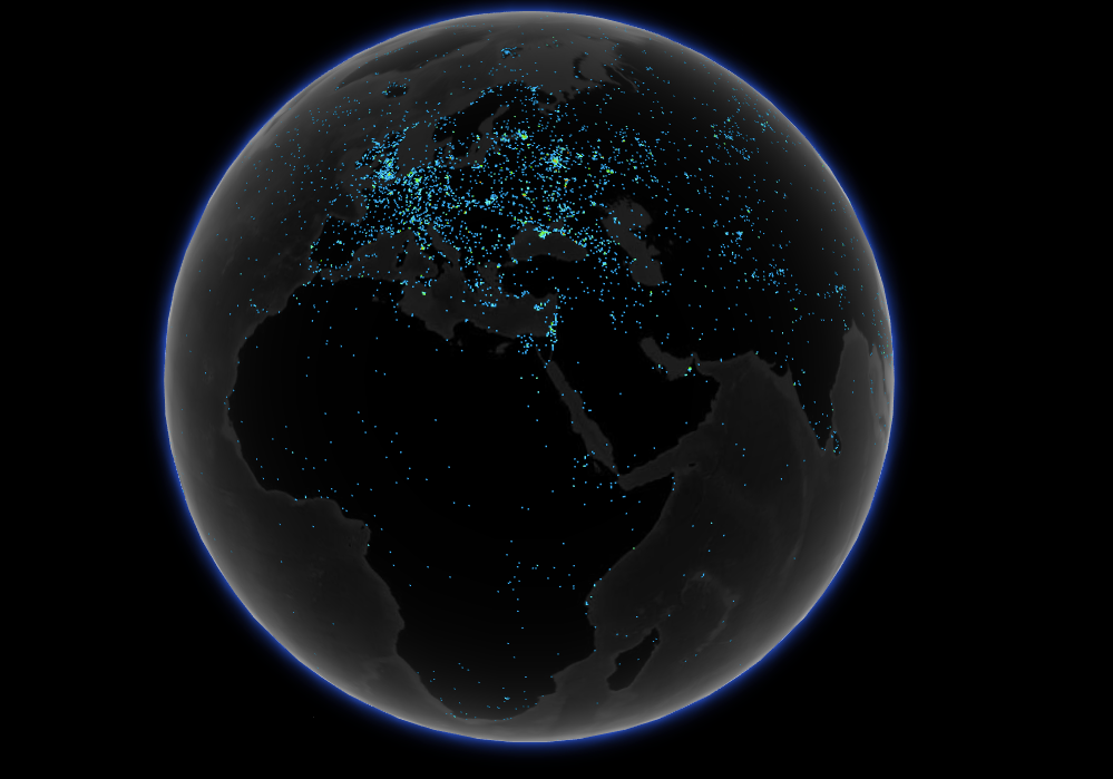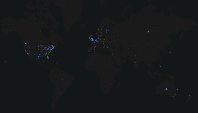 Карта мира, на которую нанесены геолокации авторов правок определенной статьи «Википедии». Вот, например, откуда писали статью про Владимира Путина на английском языке: