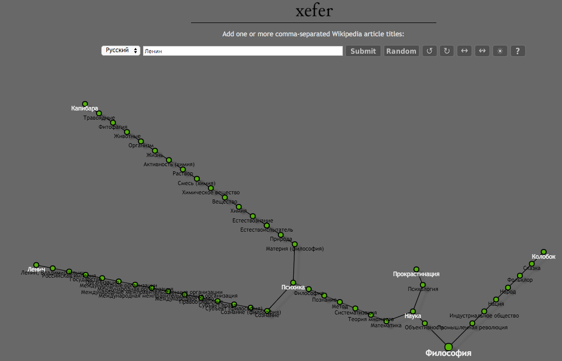 Вечная проблема — заходишь на «Википедию» почитать про капибар, а через пару часов блуждания по ссылкам внутри статей оказываешься на алгоритме Шеннона — Фано. Проект Wikipedia Recent Changes Map позволяет построить цепочку от любой статьи до статьи о философии (в том числе и русской). Можно ввести и несколько статей, чтобы увидеть, где их дороги пересекаются на пути к философии.
