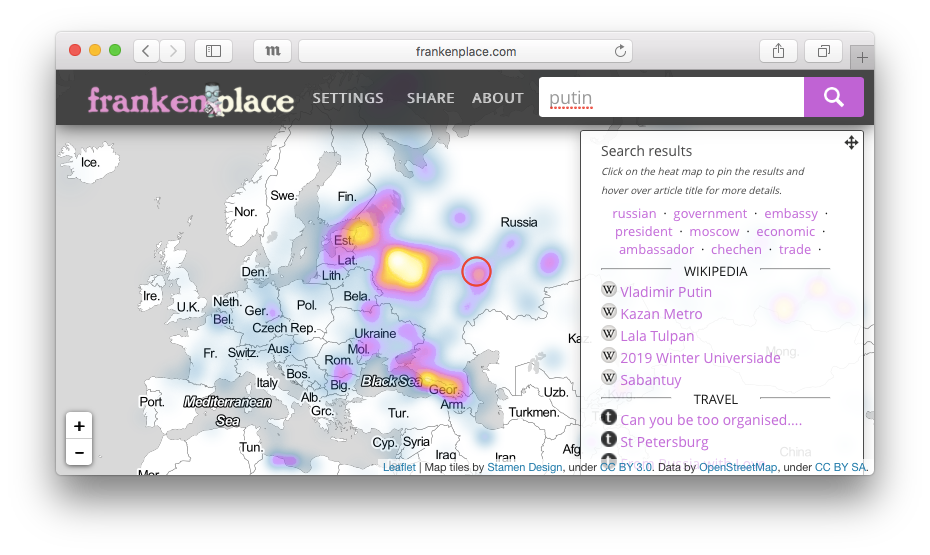 Проект Frankenplace показывает на карте статьи, в которых используется введенное пользователем слово. Получается тепловая карта — чем жирнее точка, тем активнее в статьях из этого места используется выбранное слово.