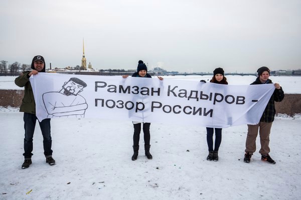 В Петербурге активисты молодежного движения "Весна" на стрелке Васильевского острова развернули баннер с надписью "Рамзан Кадыров – позор России" и карикатурой, изображающей главу Чеченской Республики в смирительной рубашке.