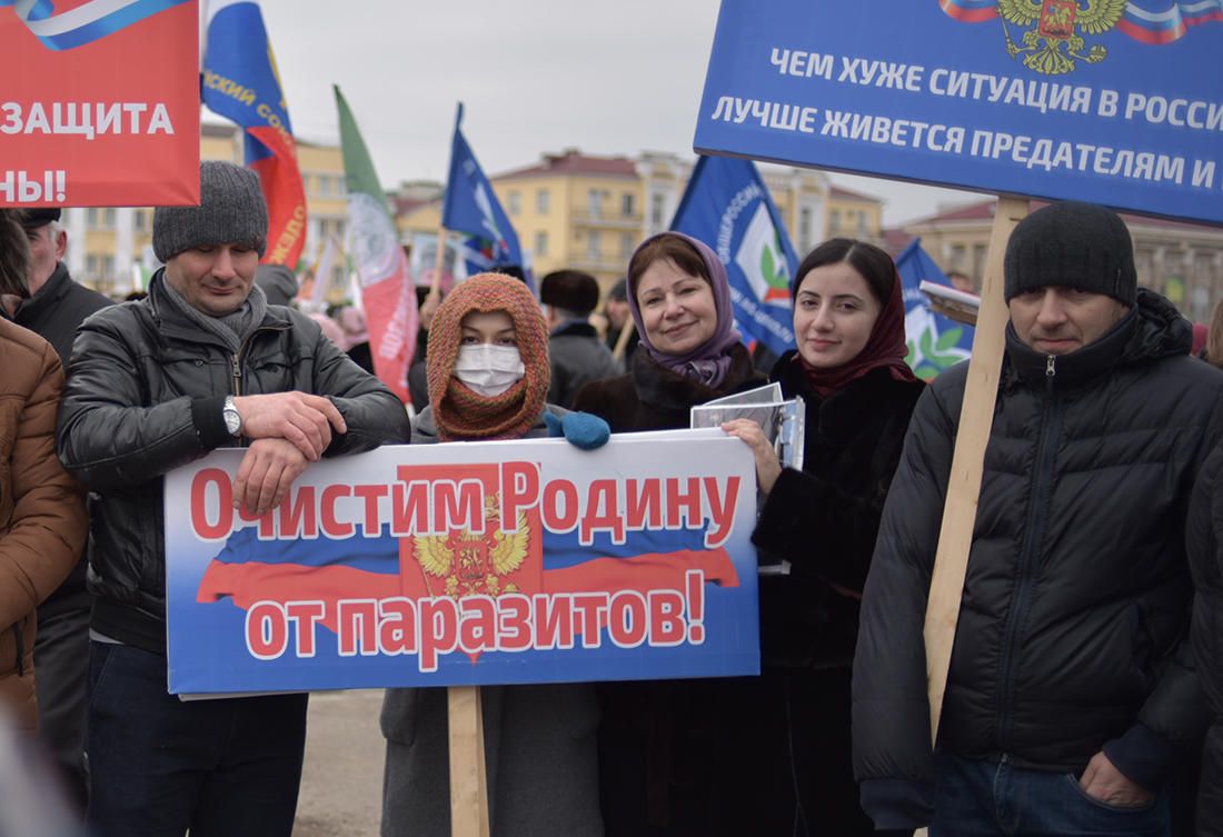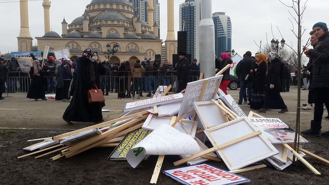 “The lie of a single freak drives a whole people up the wall,” read the inscription on another banner, next to which someone inadvertently carried a portrait of Ramzan Kadyrov.