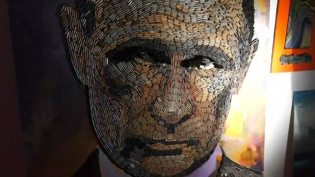 Кадр из фильма «Тайные богатства Путина», портрет президента «Лицо войны», созданный из гильз Дарьей Марченко
