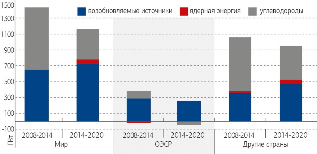 Прирост производства электроэнергии из разных источников, Источник: МЭА, 2015