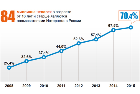 По данным исследования компании GfK, за 2015 год число интернет-пользователей в России выросло почти на 4 млн человек и составило 84 млн, а уровень проникновения интернета среди жителей нашей страны старше 16 лет достиг 70,4% (в 2014 году – 67,5%).