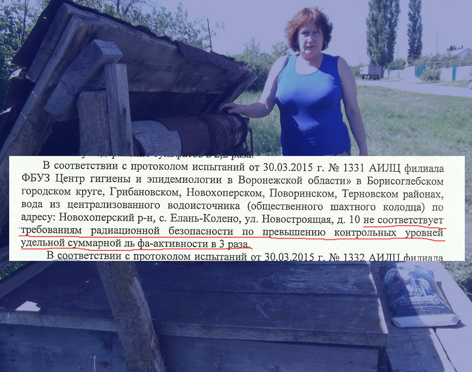По ее словам, 28 января 2016 года ей, как заявителю, удалось получить судебное постановление (скан которого выложен здесь) о проверке качества питьевой воды в действующих до сих пор общественных колодцах на ул. Новостроящая села Елань-Колено Новохопёрского района. В документе, пишет Ишкова, указано, что проверка воды из одного колодца, проведенная еще 30 марта 2015 года, выявила превышение удельной суммарной альфа-активности в 3 раза, проверка второго — в 1,6 раз. Кроме этого, вода не соответствует нормам по завышенному содержанию сухого остатка, нитратов и сульфатов и общей жесткости. Экспертизу проводил лабораторный центр Центра гигиены и эпидемиологии в Воронежской области.