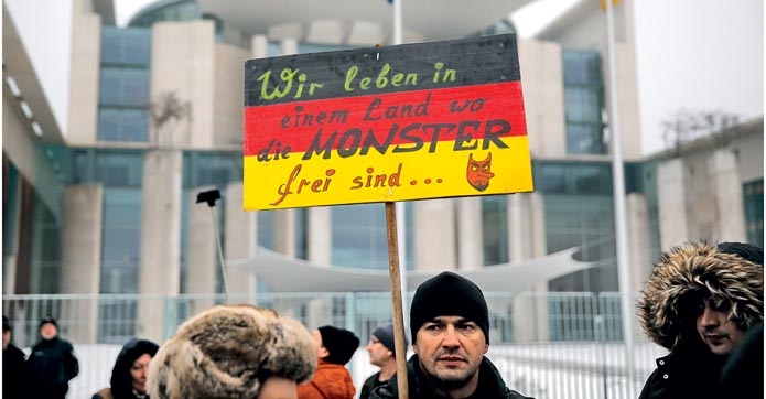 «Мы живем в стране, где монстры гуляют на свободе», — убежден, судя по плакату, русскоязычный немец, участник акции *перед ведомством федерального канцлера, Берлин, 28 января 2016 года*