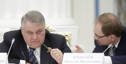 3. Директор Национального исследовательского центра "Курчатовский институт" Михаил Ковальчук и ректор Санкт-Петербургского государственного университета Николай Кропачев (слева направо) во время заседания Совета по науке и образованию в Кремле. Михаил Метцель/ТАСС
