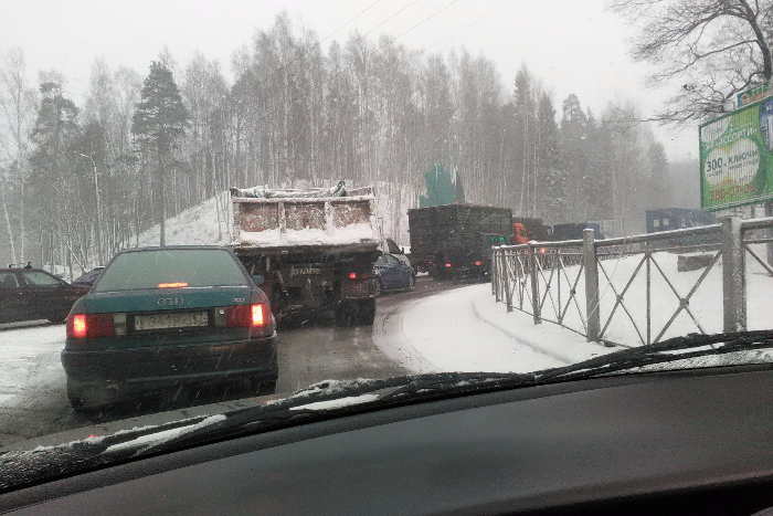 На выезде из Всеволожска собралась пробка из-за грузовиков, которые не могут подняться в гору