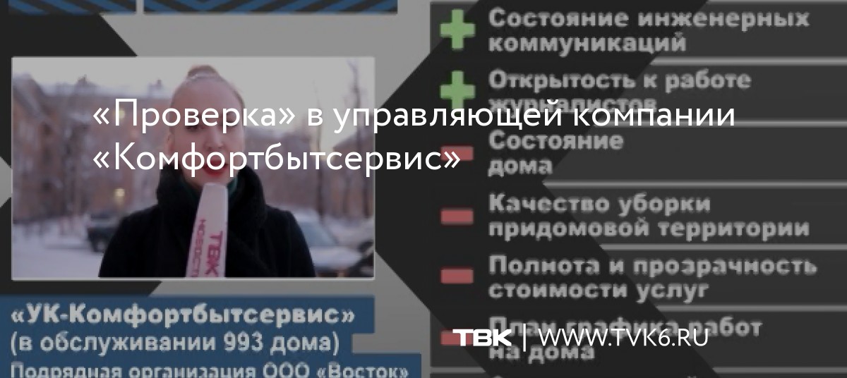 Дата03.02.2016АвторЮлия Мовшович корреспондентИсточникТВК-6Сохранённая копияInternet ArchiveOriginal MaterialShow translation«Проверка» в управляющей компании «Комфортбытсервис» По просьбам жителей дома на Московской, 5 Юлия Мовшович посмотрела, как работает управляющая компания Ленинского района «Комфортбытсеврис».