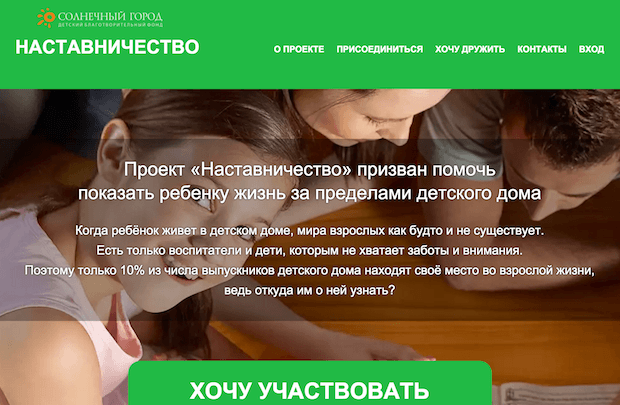 Дата05.02.2016АвторОлег ГантИсточникТеплицаСохранённая копияInternet ArchiveOriginal MaterialShow translationСайт для проекта «Наставничество» Волонтеры проекта «Наставничество» проводят индивидуальное сопровождение воспитанников детских домов детского благотворительного фонда «Солнечный Город» в Новосибирске. Для проекта был запущен отдельный информационный сайт. Подробнее о проекте.