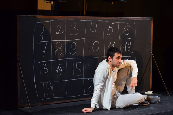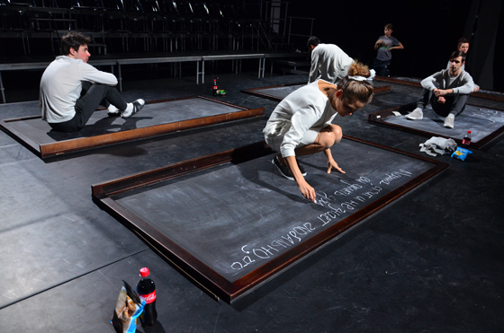 Зритель, если откроет случайно программку, может прочитать ремарки. А может эту затею оставить. Прием художников-концептуалистов, которые сопровождали свои выставки собственными текстами, был классическим этапом этого искусства. А здесь этот этап мягко подорван «квантированным» отношением к самому понятию действия. А также к его участникам на поле — на игровой площадке, размеченной школьными досками, на которых персонажи будут мелом писать случайные цифры, отсылающие к программке, к нумерологии ремарок. В них обозначено то, чего на сценическом поле нет. Или есть частично, «микрочастично» и случайно проявляется персонажами. Потомственными комбайнерами на этом чужом (норвежском почему-то, но почему — не важно) поле с неясным расположением запада, востока, юга и севера. Тут полно комбайнов, которых не видать, но которые есть в реальности галлюцинаций. Тут один из персонажей не собирается бросать работу, потому что «земля одна». Потому что эти потомственные комбайнеры больше ничего не умеют делать. «Мы убираем хлеб, а они пусть там на верху разбираются сами».