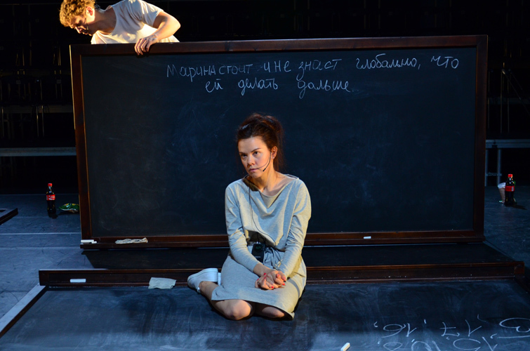 © Юлия Люстарнова Этот спектакль — динамическое поле не только относительно «современной физики». Динамическим тут становится обращение с действием — его наличием, отсутствием и точками пребывания/убывания: на игровой площадке и в программке, где напечатаны 45 ремарок Пряжко, описывающих место действия той или иной сцены, состояния и пластику героев.