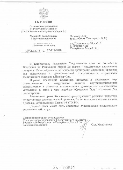 (Скан последнего ответа из СУ СК РФ по Республике Марий Эл)