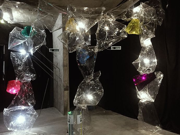 При входе в зал возвышаются три огромных леденца. Хотя это только моя личная ассоциация, потому как ни с чем сосательным они на деле не связаны. Это — «Пропускная система Кармен». Художница Лера Лернер таким образом воспроизвела образ одной из городских сумасшедших Петербурга. Некая дама по кличке «Таможенница Кармен» каждый божий день стоит у одного из выходов метро и спрашивает с народа плату за выход. И это вовсе не обязательно должны быть деньги: просто какая-нибудь безделушка или фантик или что-то в таком духе. Возле экспоната стоит чан, в который нужно что-нибудь положить, чтобы пройти дальше. Устроители выставки находчиво ввернули любимые Мытищи в описание и напомнили, что название города происходит от слова «мыта», то есть пошлина. Меня же больше интересовал материал, из которого сделаны прозрачные ворота, и я зависла возле них. Из задумчивости меня вывел вопль арт-директора, который обо что-то споткнулся в темноте и прервал моё исследование.
