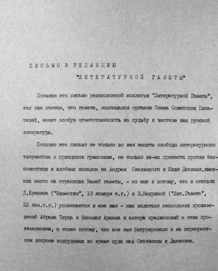 Посылаю это письмо не только во имя защиты свободы литературного творчества и принципов гуманизма, не только из-за протеста против бессовестных и злобных нападок на Андрея Синявского и Юлия Даниэля, имевших место на страницах Вашей газеты, — но еще и потому, что в статьях Д. Еремина («Известия», 13 января т<екущего> г<ода>) и З. Кедриной («Лит. Газета», 22 янв<аря> т<екущего> г<ода>) упоминается и мое имя — как издателя нескольких произведений Абрама Терца и Николая Аржака и автора предисловий к этим произведениям, а также потому, что мое имя фигурировало и на перекрестном допросе подсудимых во время суда над Синявским и Даниэлем [7].