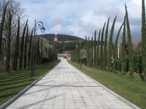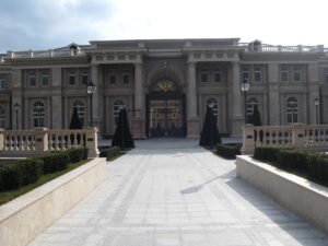 У портала дворца разбит декоративный парк. Кроме кипарисов, здесь высажены хвойные кустарники и вечнозеленые магнолии. Очевидно, на одно только искусственное озеленение были потрачены десятки миллионов рублей: было видно, что сажались уже взрослые деревья и кустарники. Декоративная растительность раскинулась в окружении естественной. Я обратил внимание на размер здешних пицундских сосен (это реликтовое растение занесено в Красную книгу России): некоторые деревья были толщиной в обхват. Ради «объекта» выкосили эталонный лес с пицундскими соснами, каковому уступают даже леса знаменитой абхазской Пицунды.