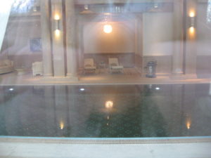 В торце имеется ниша со стеклянными стенами, за которыми были видны бассейн с подогревом и шезлонги. Все сделано таким образом, чтобы у «отдыхающих» была возможность курсировать между теплым бассейном под крышей и уличным бассейном-фонтаном.