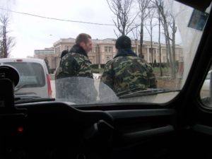 Лейтенант ФСО Никитин (тот, что на фото в черной шапочке) открыл дверь с водительской стороны и выхватил у Сурена Газаряна интернет-модем. Пока мы с Суреном пытались воззвать к совести участкового Цындрина, на глазах которого произошел грабеж, в машину (где на тот момент находились только девушки) ввалились чоповцы и начали вытаскивать рюкзаки и сумки.