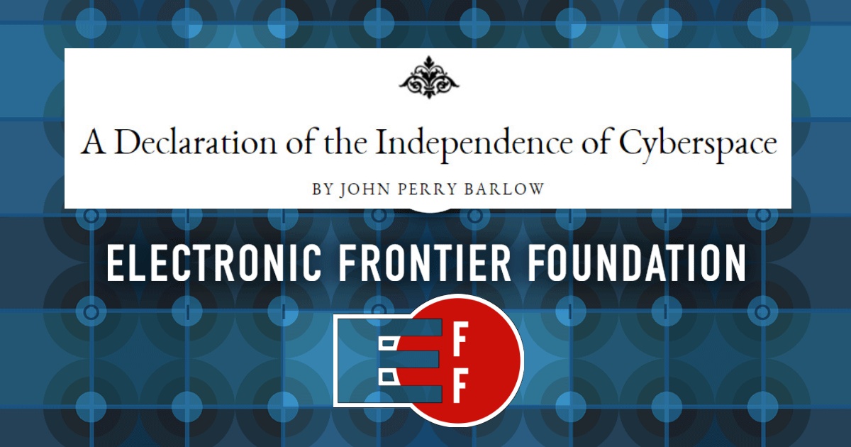 20 лет назад, в феврале 1996 года, в ответ на «Акт о пристойности в телекоммуникациях» Билла Клинтона, пытавшегося ввести цензуру в интернете, Джон Перри Барлоу, основатель общественной организации Electronic Frontier Foundation (EFF), опубликовал культовый документ под наименованием A Declaration of the Independence of Cyberspace — «Декларация независимости Киберпространства».