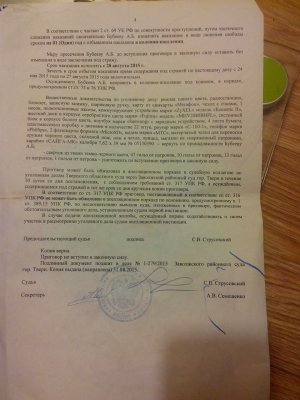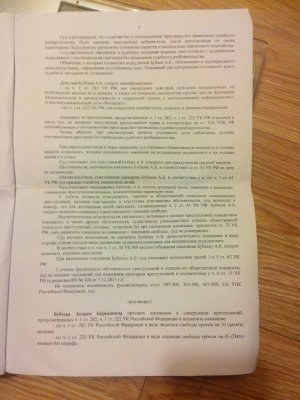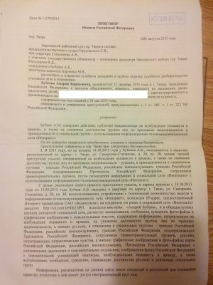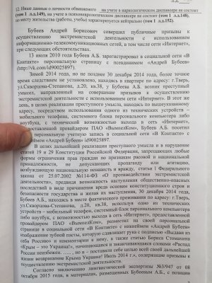 Андрей Бубеев признал вину и заключил соглашение со следствием. В связи с этим Заволжский районный суд Твери рассматривал дело, не проводя судебного разбирательства. Бубеева посчитали виновным в возбуждении ненависти и вражды (ч. 1 ст. 282 УК) в отношении русских, а также представителей таких любопытных социальных групп, как «граждане Российской Федерации» вообще, «граждане Российской Федерации, поддерживающие Президента Российской Федерации», «сотрудники правоохранительных органов» и «россияне, испытывающие патриотические чувства», — и в незаконном хранении боеприпасов (ч. 1 ст. 222 УК). 28 августа 2015 года он был приговорен к году колонии-поселения, причем этот срок суд назначил «путем частичного сложения» десяти месяцев за сетевые публикации и лишь пяти за патроны.