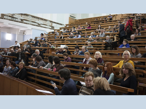 Здесь решалось будущее РГГУ? Аплодисментами, хохотом, и даже топотом – так участвовали в голосовании на выборах ректора РГГУ те, кто был лишен возможности участвовать через прямое волеизъявление на конференции коллектива (см. “Нина Брагинская о ловушке Устава и выживании Университета”). В Центральной аудитории университета собралось несколько сотен человек, в течение следующих часов очень эмоционально и напряженно следивших за происходящим на Ученом совете РГГУ (видеозапись Андрея Мороза).
