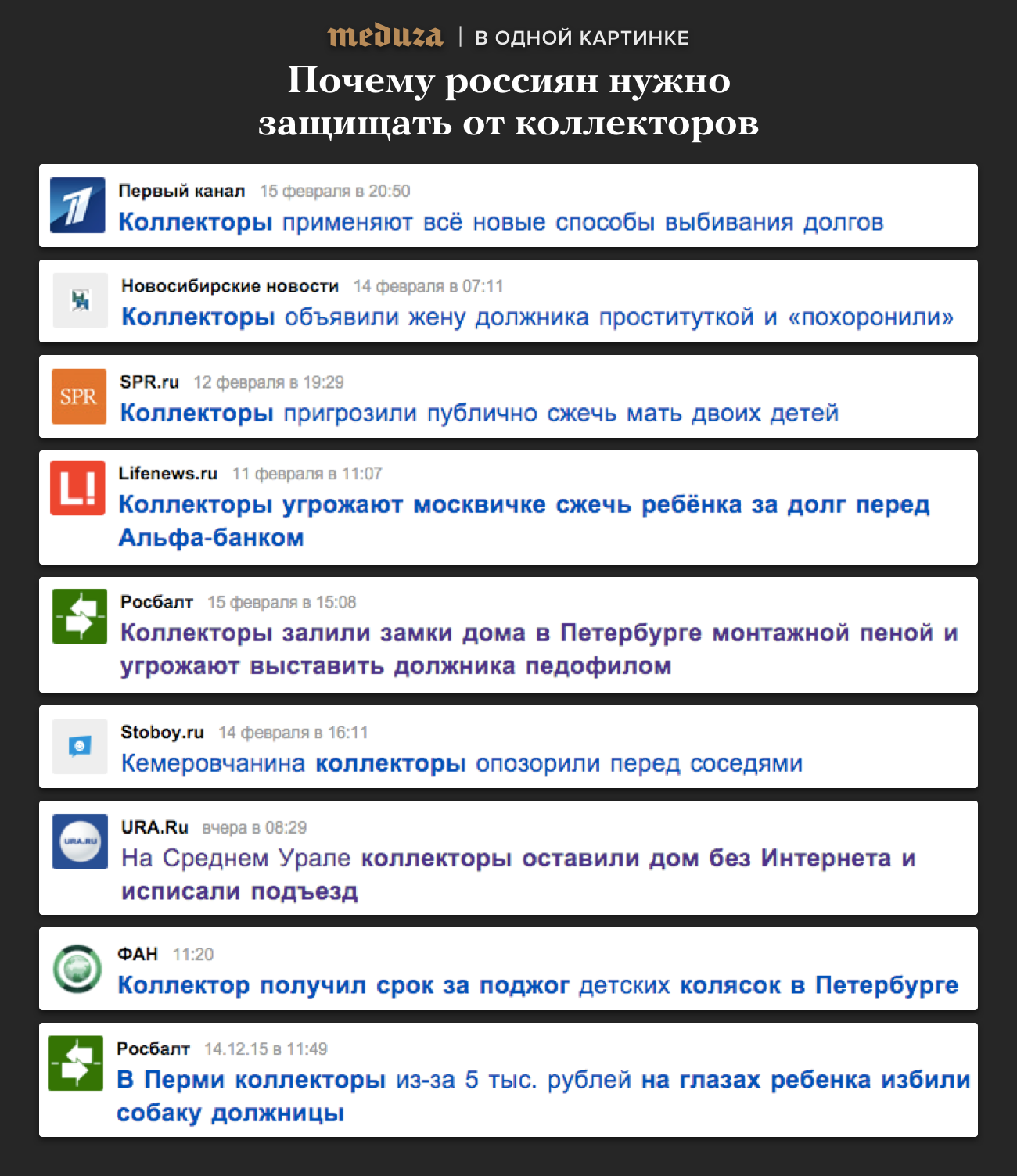 Дата17.02.2016АвторСкрытИсточникМедузаСохранённая копияInternet ArchiveOriginal MaterialShow translationКто такой коллектор. В одной картинкеПочему россиян нужно защищать от сборщиков долгов Фото в анонсе: Алексей Павлишак / ТАСС