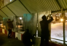 В юго-западном московском районе Теплый Стан активисты, борющиеся с незаконной постройкой многоэтажной гостиницы на месте сквера и одноэтажного здания магазинов и почты, разобрали забор вокруг стройплощадки. Об этом сообщает корреспондент "Граней" с места событий.