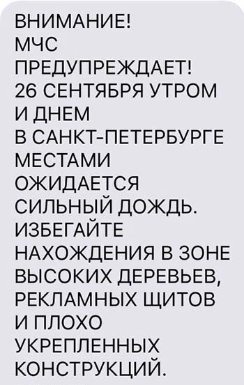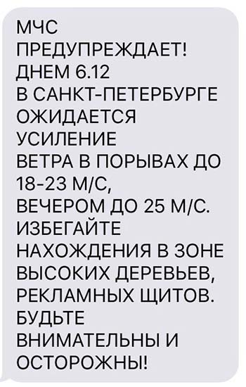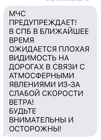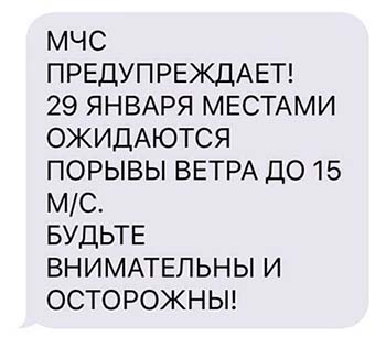 Фото из Instagram @pi_tonn МЧС организует SMS-рассылку для информирования людей либо о происшествиях, либо о погоде. К другим каналам информирования SMS подключают в двух случаях: если возникла чрезвычайная ситуация (или «социально-значимое событие», как уточняют в ведомстве) или неблагоприятные, опасные погодные условия. Например, часто МЧС пишет про гололед на дорогах, штормовой ветер.