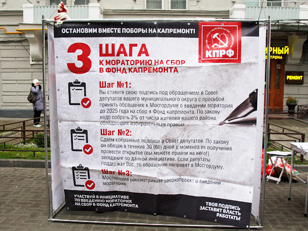 Плакаты акции по сбору подписей против закона о капремонте. Москва, октябрь 2015 г. Фото: red.msk.ru Ранее, напомним, коммунисты уверяли, что государство не вправе перекладывать на собственников оплату капитального ремонта, так как в Жилищном кодексе было указано, что это обязанность правительства.