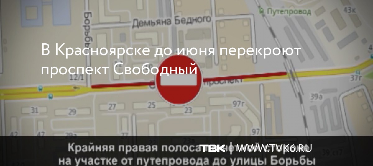 «Движение транспортных средств по пр. Свободный на участке от железнодорожного путепровода до ул. Борьбы путем перекрытия правой полосы движения по четной стороне», – говорится в сообщении мэрии Красноярска.