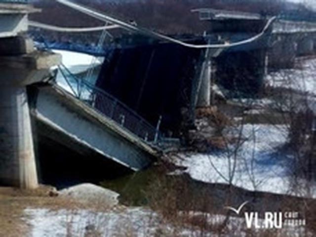 На сайте регионального МЧС уточняется, что обрушение двух пролетов моста произошло в 12:20 по местному времени (5:20 в Москве) на 127-м километре трассы город Артем - город Находка - порт Восточный.