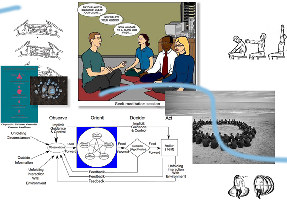 Другие главные персонажи тренинга — путешественник во времени Джон Тайтор, появившийся в интернете в 2001 году и заявивший, что прибыл из 2036-го, и пилот Джон Бойд, консультант Пентагона, разработавший на основе квантовой физики метод реагирования на ситуации, вошедший в обиход разведки, армии и бизнес-менеджмента. Семинар HCW построен по принципам Бойда: это четыре цикла «наблюдение — ориентация — решение — действие». В каждом семинаре обязательно присутствует теоретическая часть, в которой художник смешивает наработки квантовой физики, философию Агамбена, исследования Бориса Поршнева и других загадочных фигур. К теории добавляются разветвленный визуальный материал (на одних семинарах это картинки из Гугла и комиксы, на других — фильм конспирологического характера) и практические методики: участники погружают пальцы в зернистую жидкость и заряжаются ионами, медитируют или расставляют объекты таким образом, чтобы их магнитные поля служили глушилками для электронных устройств. Сам тренер в модной водолазке с атрибутикой Джона Тайтора стоит на фоне баннеров, покрытых надписями, выполненными сайентологическим шрифтом, кулеров с водой и флипчартов, на которых мелькают физические формулы, диаграммы и функции. Число участников ограничено, одну сессию может посетить только четыре человека. Это позволяет тренеру обращаться индивидуально к каждому и использовать его личный опыт в собственном повествовании. Также художник пользуется методами холодного чтения и одитингом Рона Хаббарда, постоянно задавая личные вопросы и интерпретируя их в научном ключе.