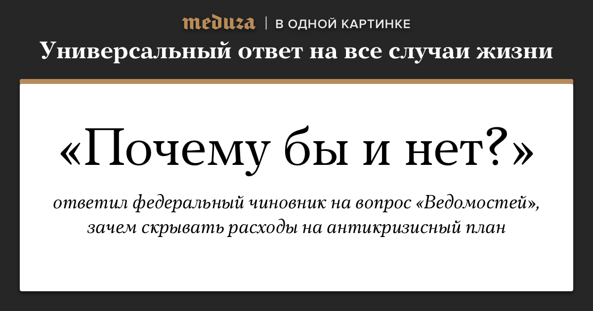 Дата26.02.2016АвторСкрытИсточникМедузаСохранённая копияInternet ArchiveOriginal MaterialShow translationУниверсальный ответ на все случаи жизни. В одной картинкеУчитесь у федерального чиновника! Фото в анонсе: PhotoXPress Подробнее про засекречивание данных об антикризисном плане.