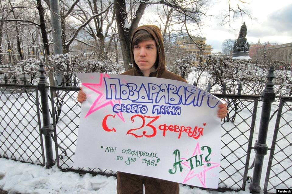 Открытый гей и актер stand up шоу Андрей Петров вышел 23 февраля на центральные улицы Петербурга с плакатом "Поздравляю своего парня с 23 февраля. Мы отслужили два года. А ты?". Таким образом, он высказался одновременно против гомофобии в городе, где живет "рыжий человечек", и праздника День защитника отечества.