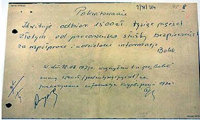 Расписка в получении денежного вознаграждения за подписью агента Болека и подтверждение факта передачи денежных средств офицером Службы безопасности (СБ) МВД ПНР: *«Подтверждаю получение от сотрудника службы безопасности 1500 злотых за сотрудничество и переданную информацию. Болек».*