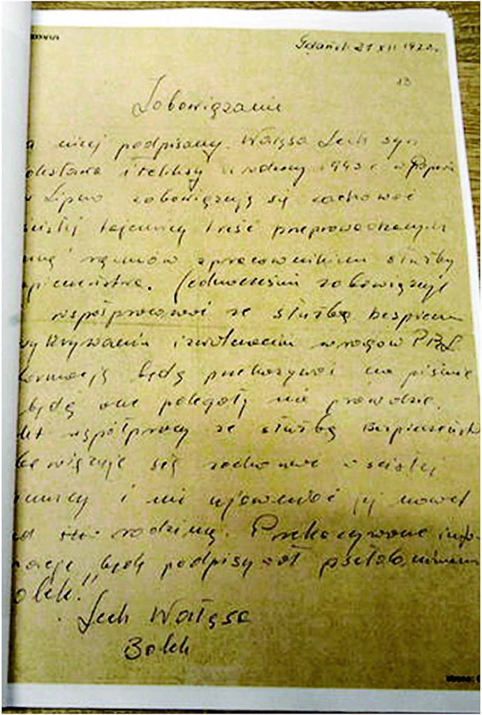 «Я, нижеподписавшийся Валенса Лех, сын Болеслава и Феликсы, рожденный в 1943 году в Попове, обязуюсь хранить в строгой тайне содержание бесед, проведенных со мной сотрудниками службы безопасности.