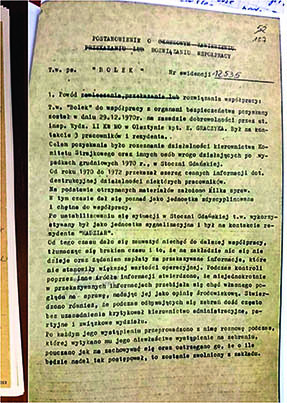 Свои выступления всегда объяснял тем, что если не будет защищать работников, то полностью потеряет доверие среди коллектива и не будет знать, что происходит. Несмотря на наши многочисленные предупреждения, 11.02.1976 г., выступая на собрании профсоюза, в очерняющей манере обвинил административное, партийное и профсоюзное руководство… За свое выступление 30.04.1976 г. был уволен с работы. В связи с вышесказанным, принимая во внимание ненадлежащее поведение тайного сотрудника Болека, а также то, что он был уволен с работы, предлагаю исключить его из агентурной сети, а имеющиеся папки, персональную и рабочую, передать в архив».