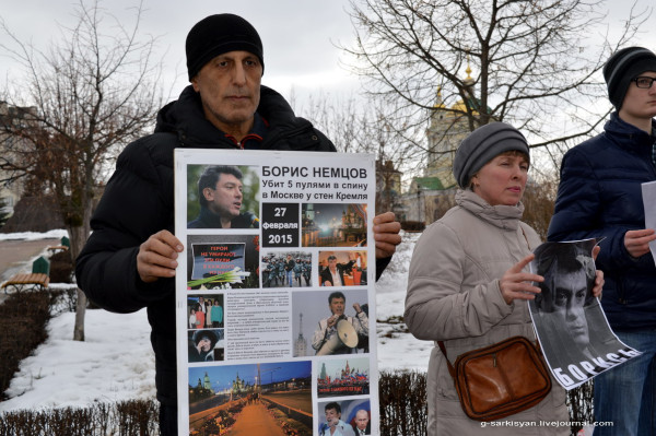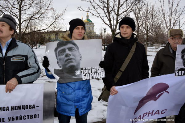 Поначалу в пикете памяти Немцова было немного людей, потом народ подтянулся.