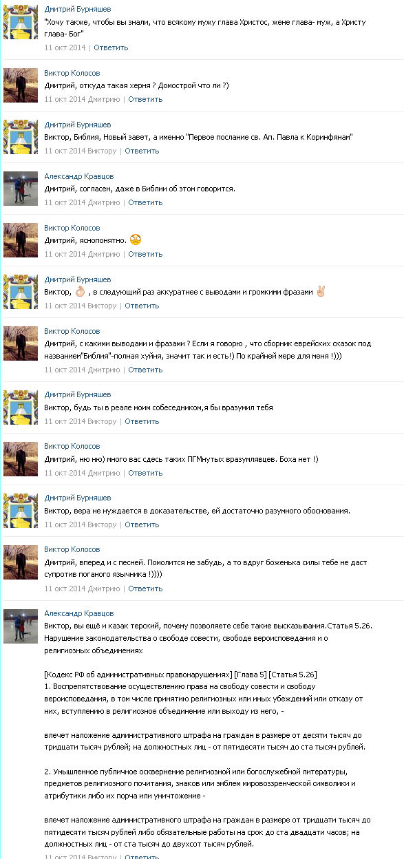 В октябре-ноябре 2014 года ставрополец Виктор Краснов спорил в региональных группах "ВКонтакте" о существовании бога и природе разных традиционных праздников. Разговоры шли в обычной для сети вольной форме. Вскоре выяснилось, что двое оппонентов Виктора (выступавшего в сети под псевдонимом Колосов) подали на него заявления. Одновременно он стал получать анонимные угрозы.