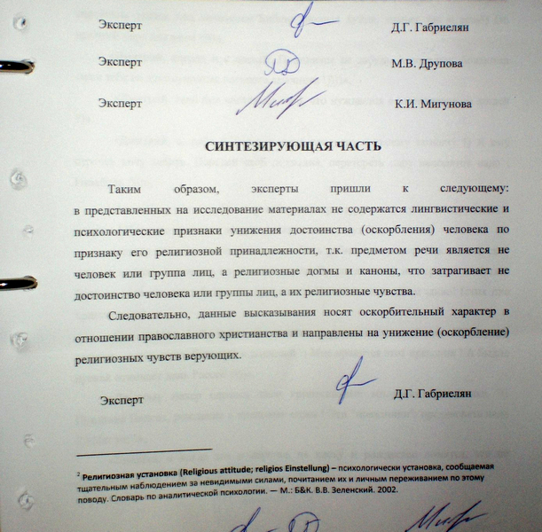 Следствие принудительно поместило Виктора на месяц в психиатрическую больницу. Экспертиза сочла его вменяемым. Другая экспертиза - лингвистическая, проведенная специалистами Северо-Кавказского центра судебной экспертизы Д. Габриеляном, М. Друповой и К. Мигуновой, - сделала парадоксальный вывод: в словах Виктора не содержится оскорбления (унижения) человека по признаку религиозной принадлежности, но усматривается оскорбление его чувств.