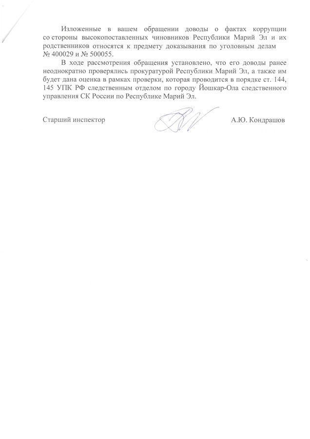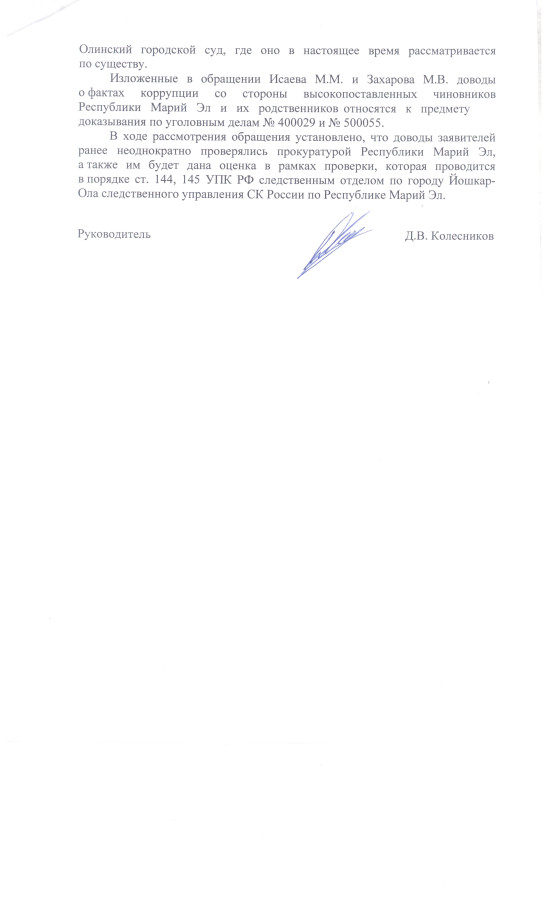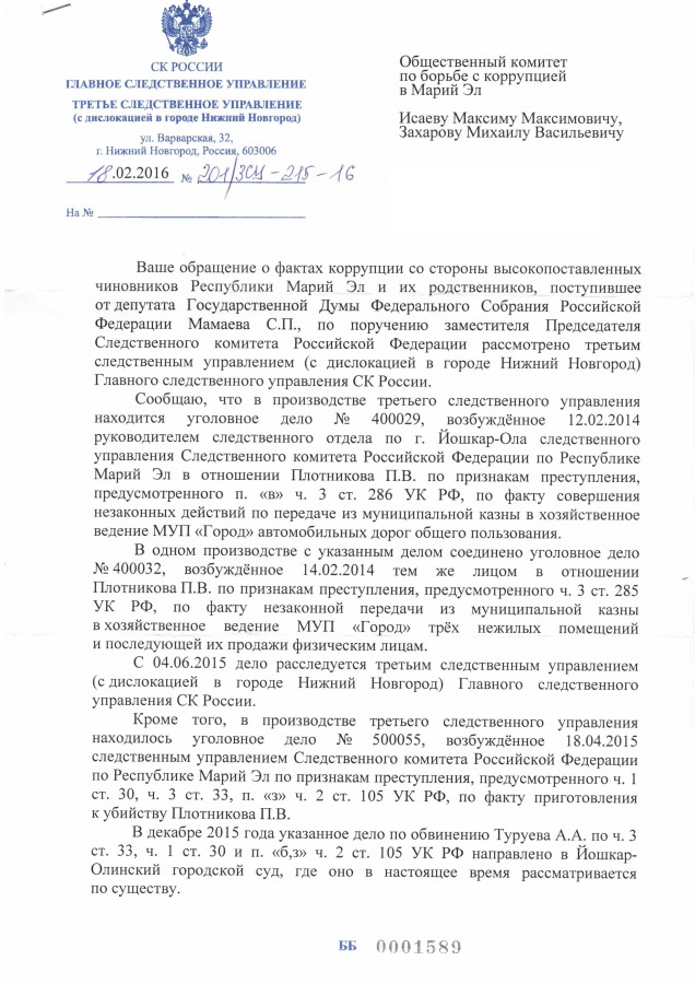 Руководитель третьего следственного управления Главного Следственного Управления Следственного Комитета России Денис Колесников в официальном ответе депутату Госдумы Сергею Мамаеву сообщил, что изложенные в обращении депутата факты коррупционной деятельности высокопоставленных чиновников из Правительства Марий Эл будут приобщены к предмету доказывания по уголовным делам (№400029 и №500055) Павла Плотникова и Александра Туруева.