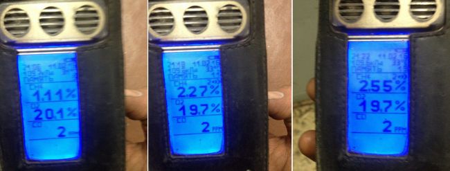Датчики второго типа — газоанализаторы — выдаются горнякам непосредственно перед спуском под землю. С их помощью они могут определить концентрацию газа в любом месте шахты. Когда датчики начинают пищать (это означает, что концентрация метана — больше 1%), работник сообщает об этом своему начальнику, горному мастеру или специалисту по технике безопасности. Они сами принимают решение остановить работу, согласовав это с диспетчером наверху, и проветрить лаву. Фотографии именно таких датчиков и опубликовала Дарья Трясухо после взрывов на «Северной». На них видно, что концентрация метана превысила допустимый уровень на четверть. Однако пока неизвестно, действительно ли эти снимки были сделаны на шахте «Северная» — и правда ли 11 февраля, то есть до взрывов. Руководство «Воркутауголь» никак эти фотографии не комментировало.