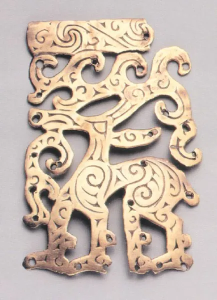 Подобным способом удалось обнаружить следы китайской традиции на золотых оковках деревянных сосудов из первого Филипповского кургана IV века до н. э. на Южном Урале. Деревянные сосуды — предмет обихода кочевников, а чаши с золотыми обкладками, вероятнее всего, использовались в ритуалах. На ажурных оковках сосудов из Филипповки изображены животные в скифском зверином стиле, однако в весьма оригинальном его варианте. Эти изображения особенно витиеваты и пышны, хотя и построены по законам скифского искусства. Сосредоточившись на мелких деталях в поисках «почерка мастера», мы увидим признаки, характерные для орнаментов в виде переплетенных фигурок змей на бронзовых сосудах Китая в это время. При этом многие оковки литые, и изготовить такие сложные предметы в этой технике было не под силу кочевникам — так же, как и делать стекло, вставками из которого украшены некоторые изделия.
