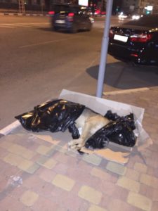 Как отмечают волонтеры, если раньше тела животных увозили утром и днем, то теперь их лишь заворачивают в пакеты и оставляют до поздней ночи. — Чтобы не светиться, видимо, решили приехать за ними под покровом ночи, — предполагает Елена. — И вот эти трупы целыми днями лежат на центральных улицах города!