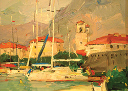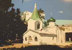 Если Владимир Давыдов отсекает всё лишнее, то для Владимира Кожевникова, возможно, «лишнее» как раз и есть самое интересное. Он скорее склонен видеть мир в более радужном свете. Контуры он, конечно же, не игнорирует, от реализма далеко не уходит, но его насыщенные «весёлые» и не очень краски важнее узнаваемых очертаний… Посмотреть хотя бы на изображение Псковского кремля. У Владимира Кожевникова это не столько храм в окружении стен и башен, а историческая глыба.