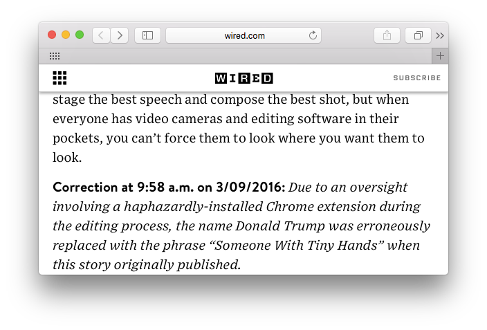 Позднее материал исправили. В поправке, которая появилась в конце статьи через два часа после ее публикации, говорится: «Из-за оплошности в ходе редактирования, в частности, случайно установленного расширения для Chrome, имя Дональда Трампа было ошибочно заменено на фразу „кто-то с маленькими ручками“». Если вам нужно это расширение, вот оно.
