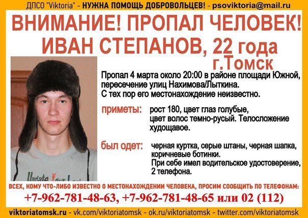 «Сегодня, 9.03.16, в 20:15 состоится сбор по поиску Степанова Ивана. Место сбора — у Лагерного Сада. Теплые вещи обязательно, при себе желательно иметь фонари. Нам очень нужна ваша помощь. Пропавший может находиться в состоянии дезоориентации, страдает потерей памяти. Телефон координатора-8-909-546-49-18 Александра», — говорится в сообщении.