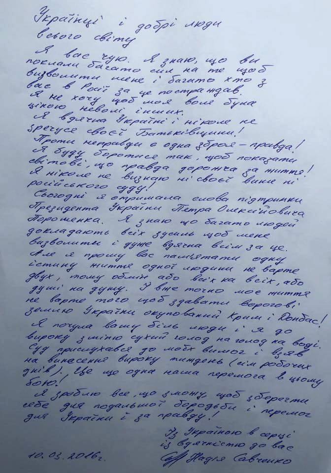 Сегодня я получила слова поддержки от Президента Украины Петра Алексеевича Порошенко. Я знаю, что многие люди прилагают все усилия, чтобы меня освободить, и я очень благодарна всем за это. Но я прошу вас помнить одну истину. Жизнь одного человека не стоит жизни двух, поэтому обмен либо всех на всех, либо душа на душу. И уж точно моя жизнь не стоит того, чтобы сдавать врагу землю Украины, оккупированный Крым и Донбасс!