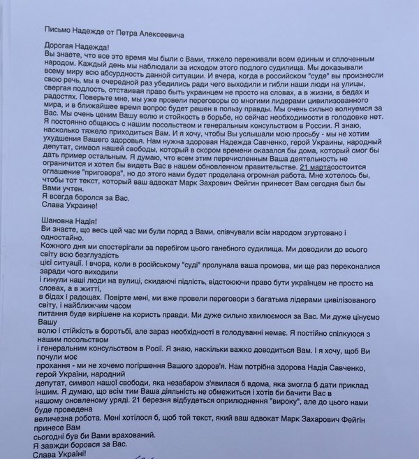 Генеральный консул Украины Виталий Москаленко и Марк Фейгин в четверг передали Надежде Савченко письмо якобы президента Украины Петра Порошенко, в котором он просил ее прекратить сухую голодовку. Там, в частности, говорилось, что "мы очень сильно волнуемся за Вас. Мы очень ценим Вашу волю и стойкость в борьбе, но сейчас необходимости в голодовке нет... И я хочу, чтобы Вы услышали мою просьбу – мы не хотим ухудшения Вашего здоровья".
